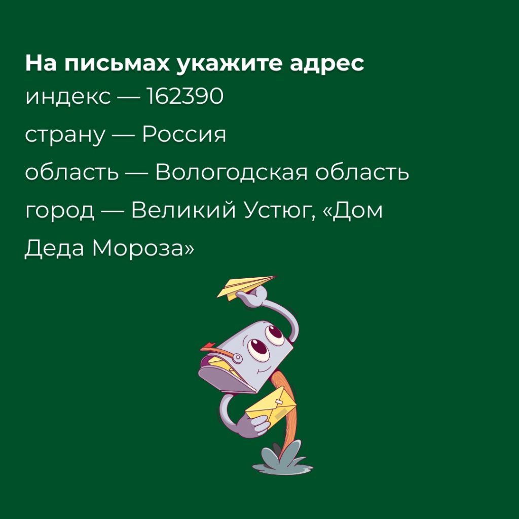 Без рубрики Новости 25.12.2023 / Вот и наступила новогодняя пора, которую так ждёт каждый ребёнок. Самое время написать Дедушке Морозу! Смотрите в карточках, как отправить письмо Дедушке и на какой адрес, чтобы получить ответ