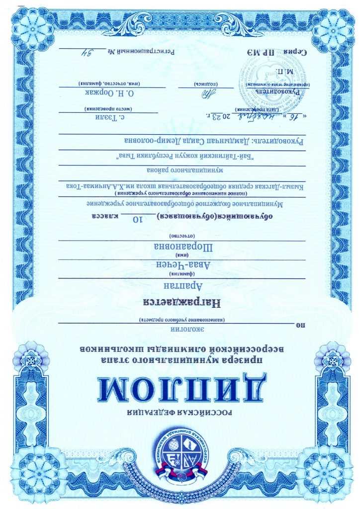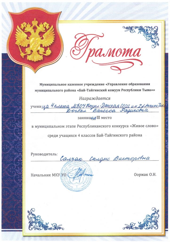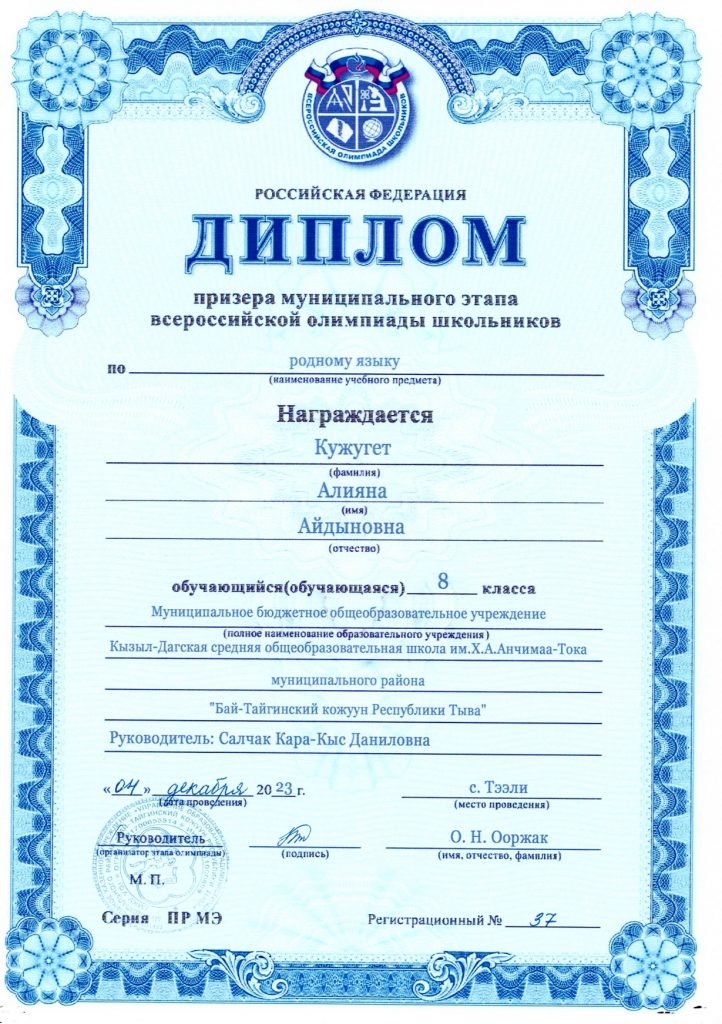 Кужугет Алияна (8 класс) – Родной язык – призер