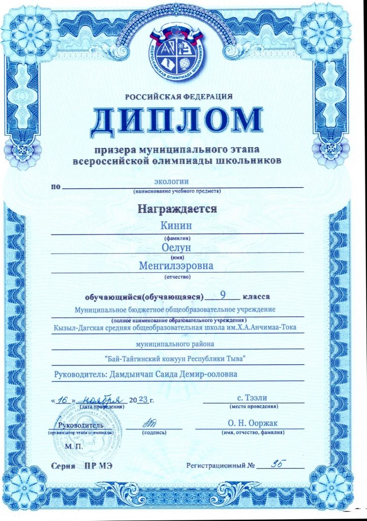 Кинин Оелун (9 класс) – Экология – призер