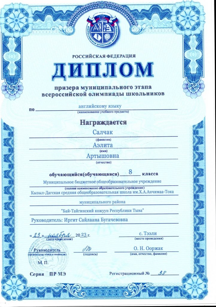 Салчак Аэлита (8 класс) – Английский язык – призер