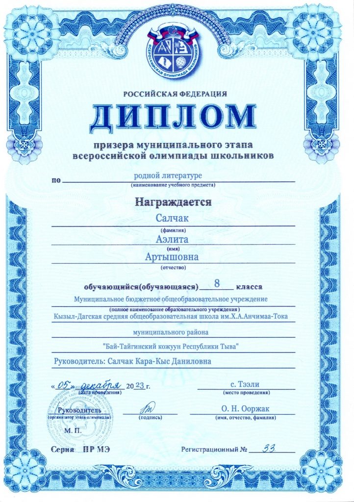 Салчак Аэлита (8 класс) – Родная литература — призер