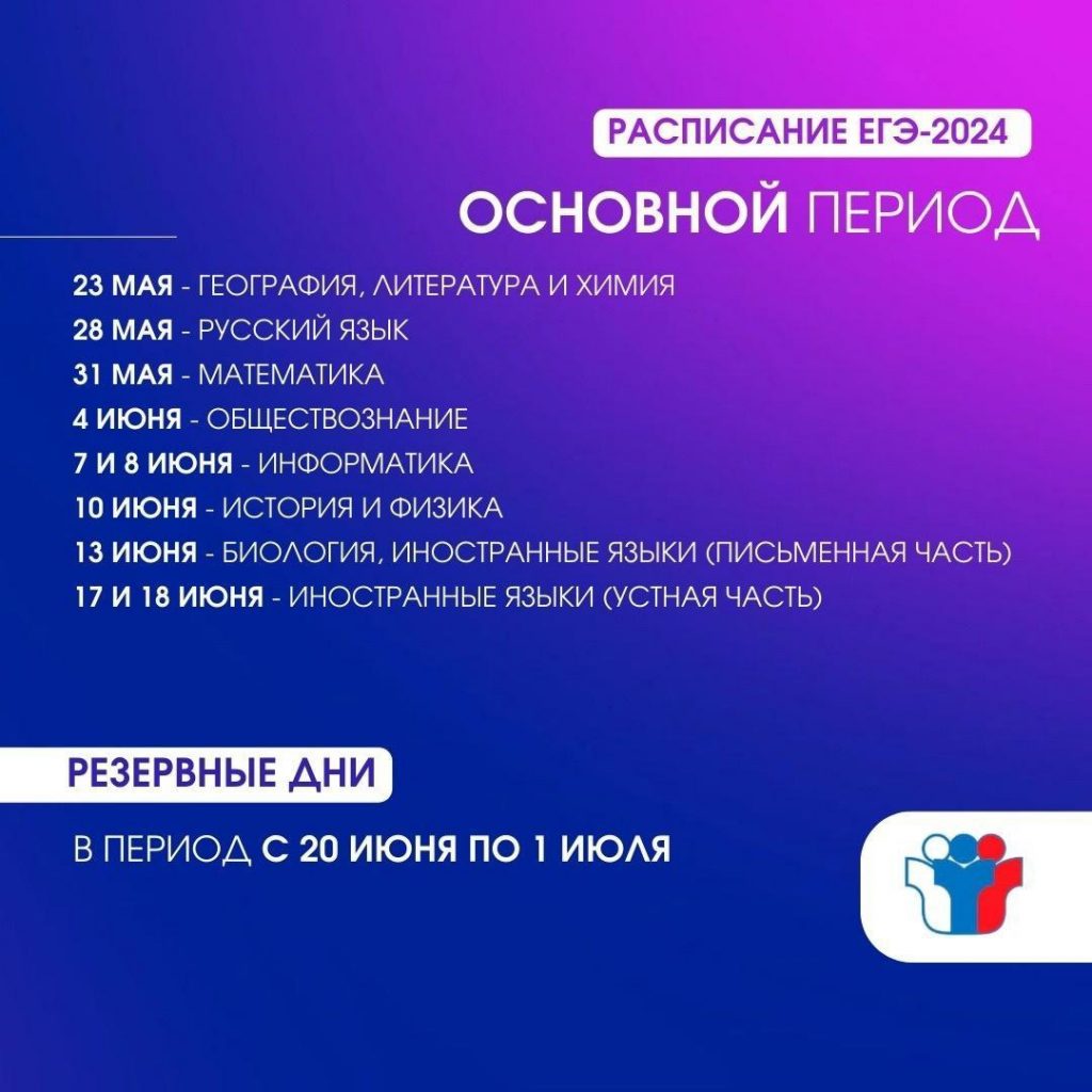 Основной период начнется 23 мая с ЕГЭ по географии, литературе и химии. Остальные экзамены пройдут в следующие сроки: