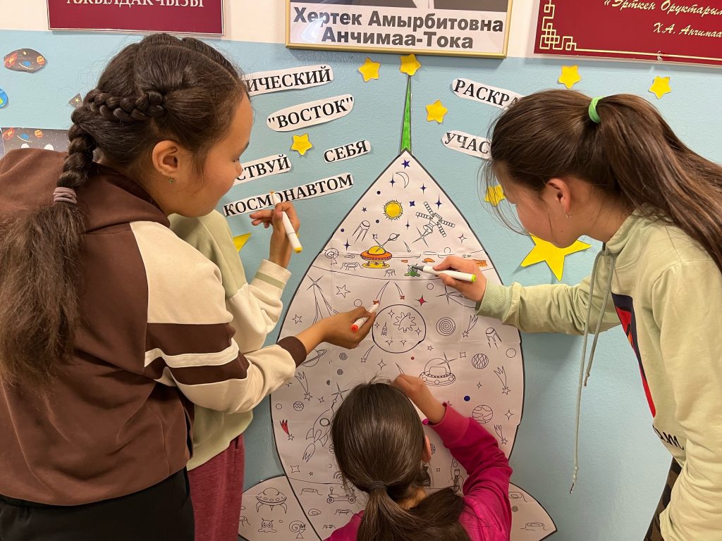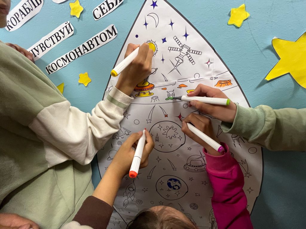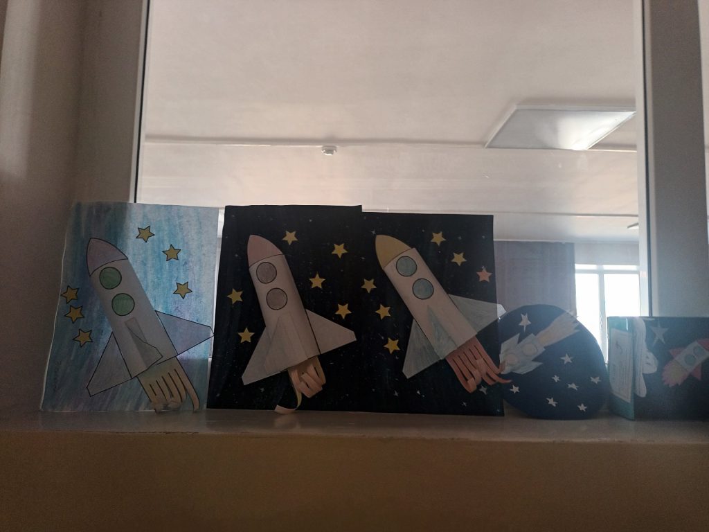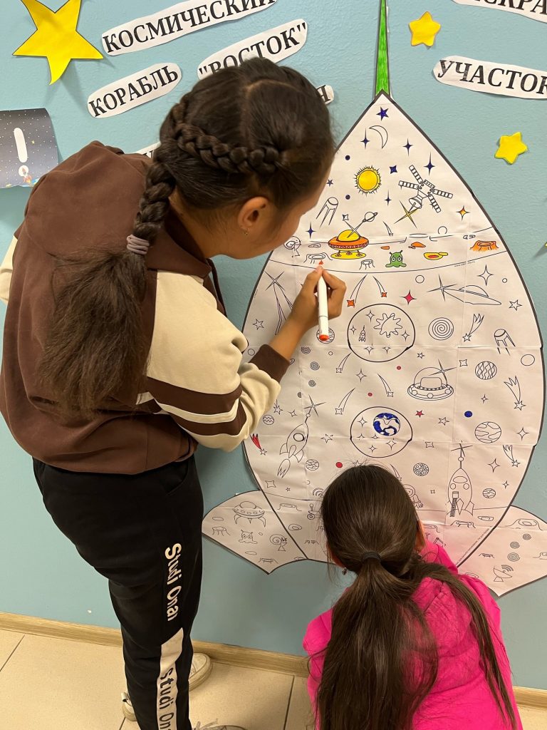После игры ученики раскрасили желаемый участок в большой раскраске-ракете и выставили работы 2,3 классы