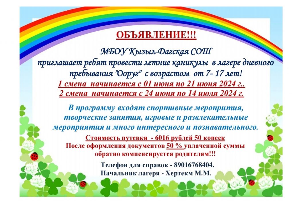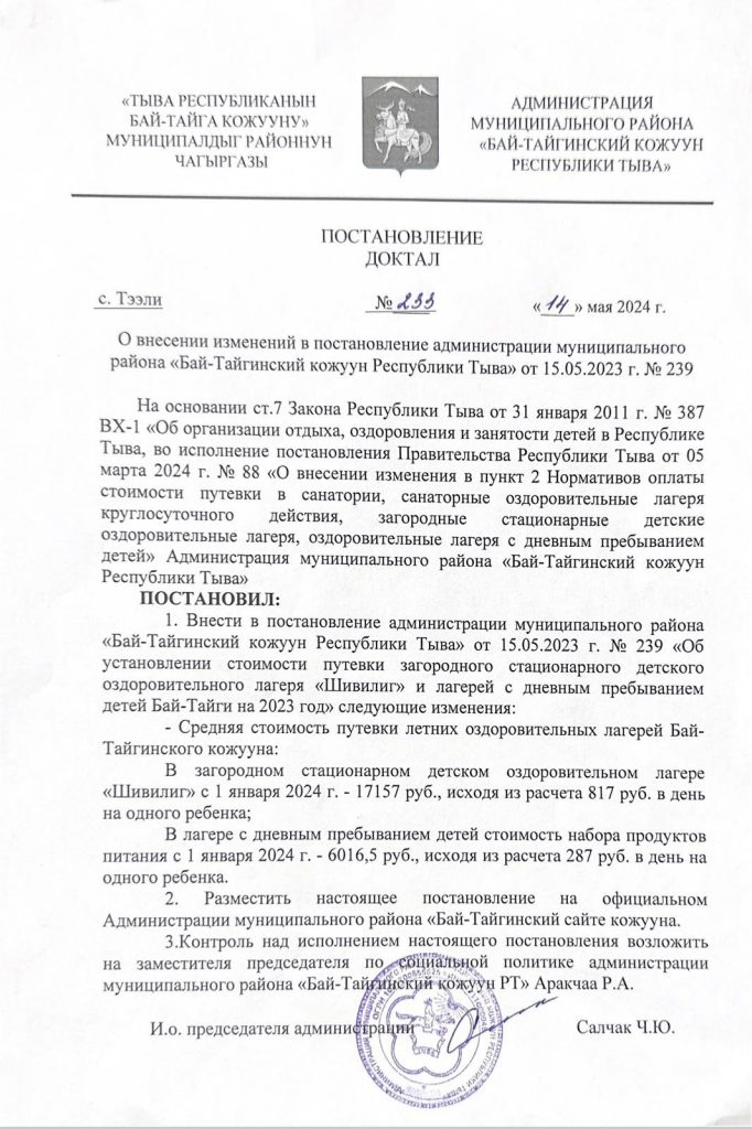 Без рубрики Объявление!!! 17.05.2024 / Экии хундулуг башкылар болгаш ада-иелер! Кожууннун ундурген доктаалынга даянып лагерьнин ортээн чарлап салдывыс. Путевканы садып алгаш документилерин чыыпкаш дужааптарга толээн акшазынын 50% дедир эгидип бээр.