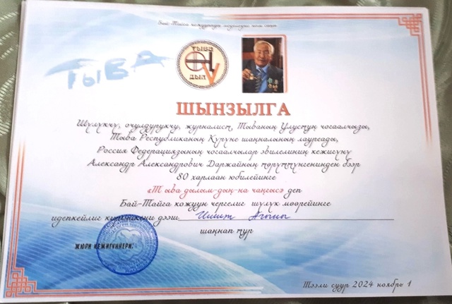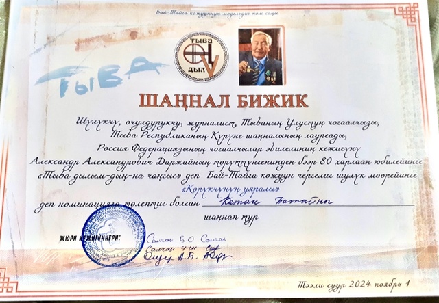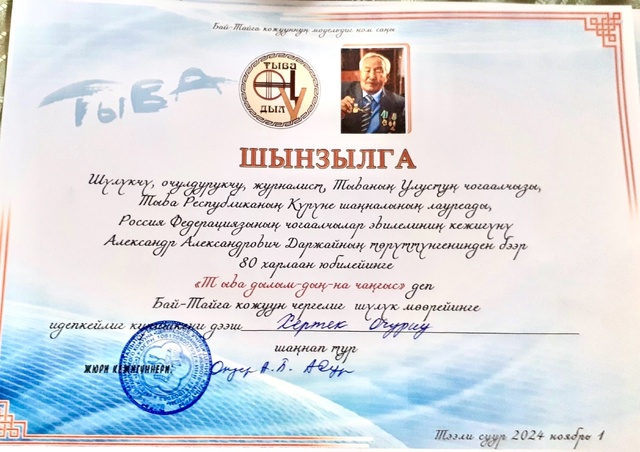 Бөгүн 01.11.2024 Тыва дыл хүнүнде А. Даржайның 80 харлаан юбилейинге тураскааткан «Тыва дылым дың-на чаңгыс» деп кожуун чергелиг шүлүк мөөрейинге бистиң өөреникчилеривис Хертек Очур (5 кл.), Имит Агы (7 кл.), Катан Бадый (10 кл.) идепкейлиг киришкеннер.