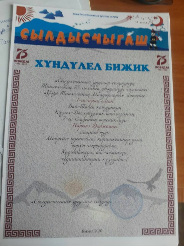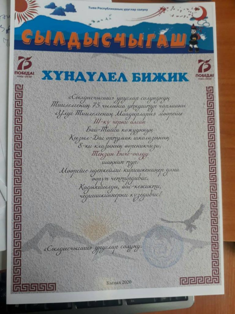 Тыва республиканын»Сылдысчыгаш» аттыг уруглар солунунун чарлааны «Улуг Тиилелгенин Маадырлары»деп чогаадыкчы ажылдар моорейге бистин Кызыл-Даг ортумак школазынын «Лирика» болгумунун оореникчилеринин чедиишкиннери.