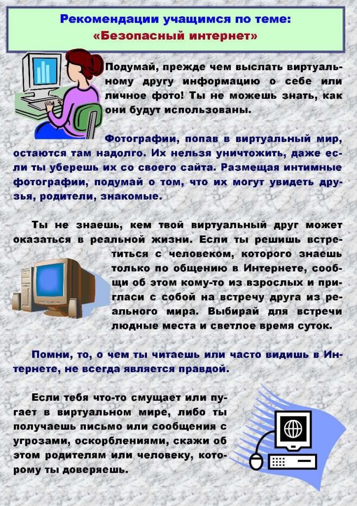 Плюсы — возможность общения, помощь в обучении, развитие внимания, воображения, возможность всегда оставаться в курсе происходящего. Минусы — отнимает много свободного времени, проблема социализации у детей, отсутствие знаний о границах поведения. Также болезни глаз, искривление позвоночника, головные боли, подъем психотических проявлений (беспокойство, депрессия). К тому же в виртуальном мире дети и подростки не чувствуют опасности. Сделать их пребывание в Интернете безопасным, научить их ориентироваться в киберпространстве – важная задача их родителей.