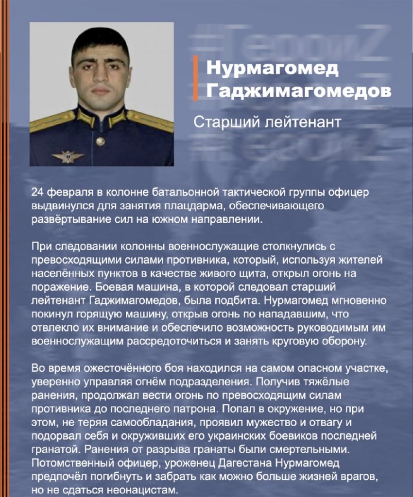 До последнего патрона с превосходящими силами противника сражался старший лейтенант Нурмагомед Гаджимагомедов. Попав в окружение, он подорвал себя гранатой вместе с боевиками, чтобы обеспечить безопасный подход своим товарищам. Своим указом Владимир Путин присвоил ему звание Героя России (посмертно).
