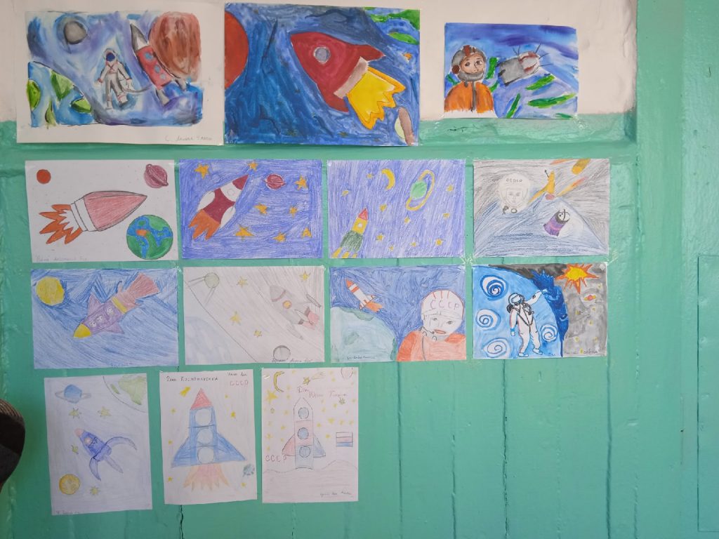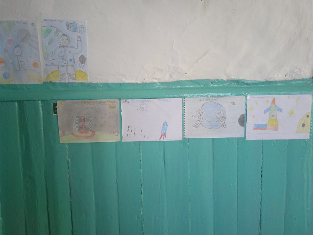 Ребятами были представлены красочные творческие работы. Оформлена выставка рисунков по теме «Я рисую космос и космонавта» среди начальных классов.