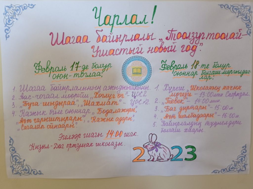 Шагаа – биле! Чаа-чылды, чылыг часты Чалбарыглыг уткуулунар! Чаагай чараш чанчылывыс Шагаа хуну унуп келди. Тыва чоннун шаандан тура Тывызыксыг солун байырлалы Шаг чаагай, шагаа чаагай Шагаа келди, амыр-мендээ! Шагаа байырлалынын болуп эртер хемчеглери: