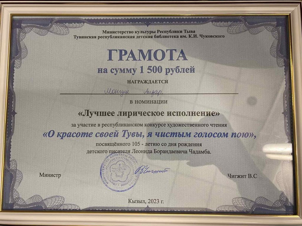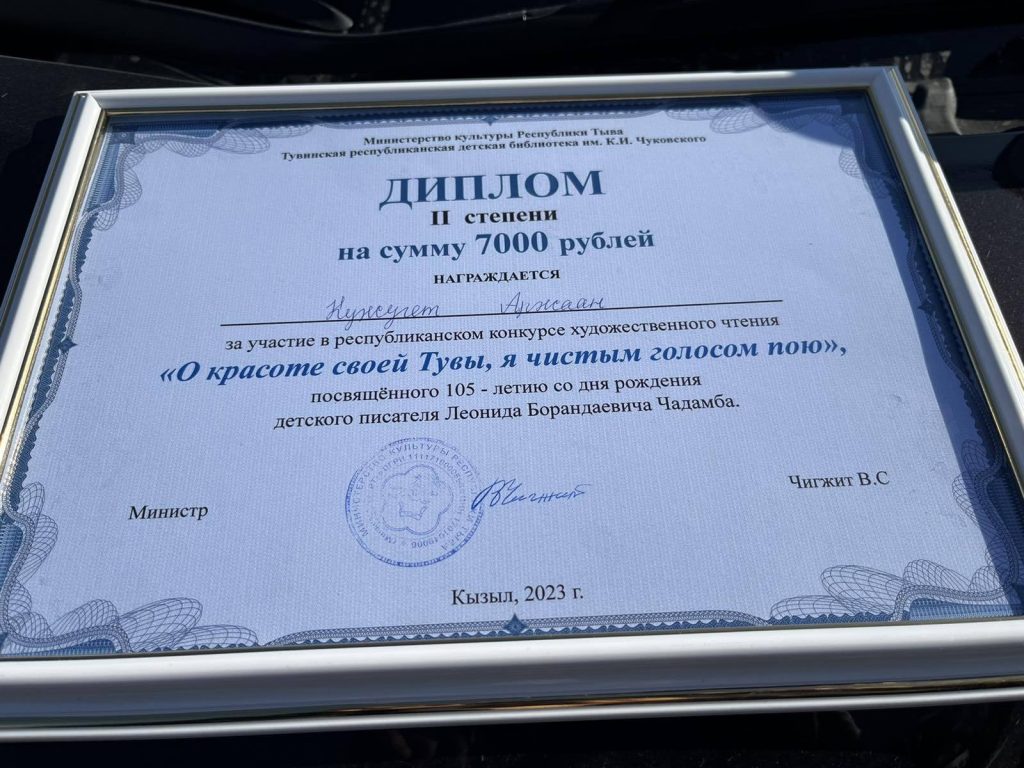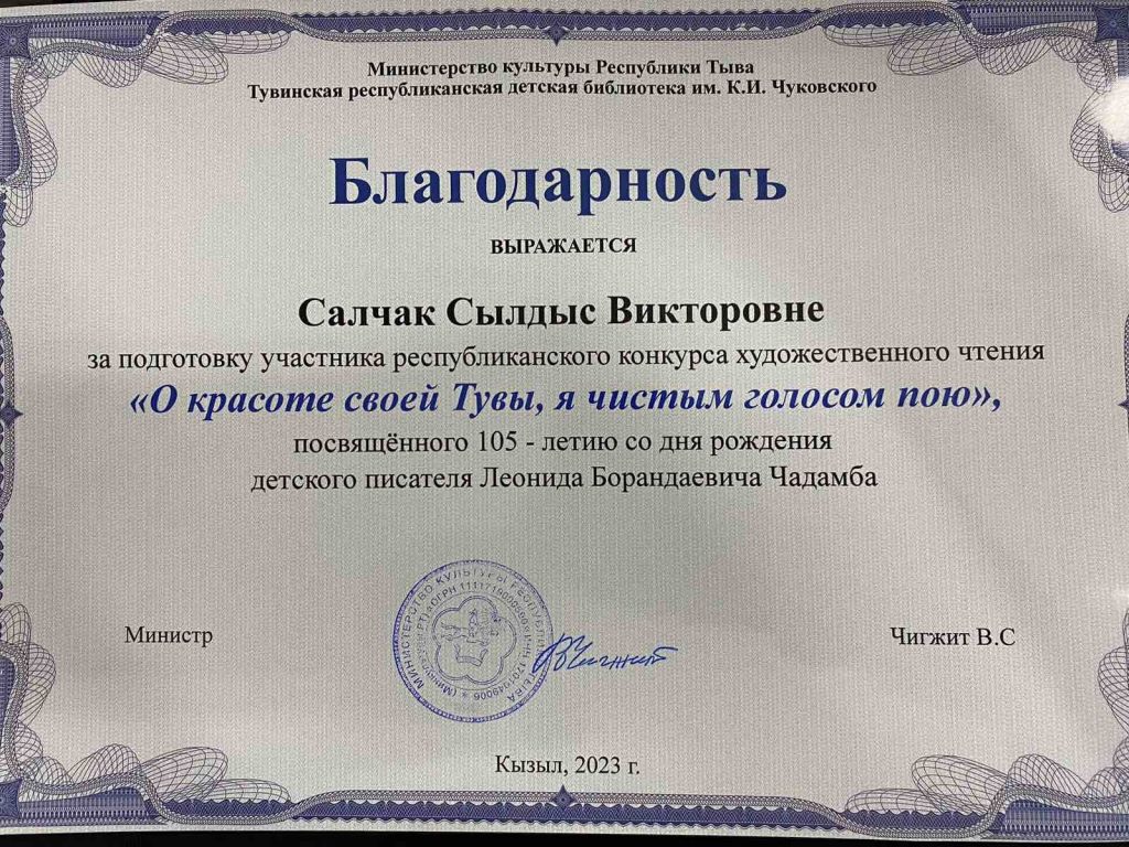 17 марта 2023 года в г. Кызыле прошёл конкурс художественного чтения «О красоте своей Тувы, я чистым голосом пою», посвященного 105-летию со дня рождения детского писателя Леонида Борандаевича Чадамба. Учащиеся МБОУ Кызыл-Дагская СОШ победители муниципального этапа конкурса Монгуш Алдар ученик 3 класса и обладатель 2 места Кужугет Аржаан представили Бай-Тайгинский кожуун. Кужугет Аржаан стал дипломантом II степени, а Монгуш Алдар стал обладателем в номинации «Лирическое исполнение». Мы гордимся ими и желаем им дальнейших творческих успехов.