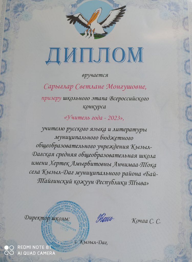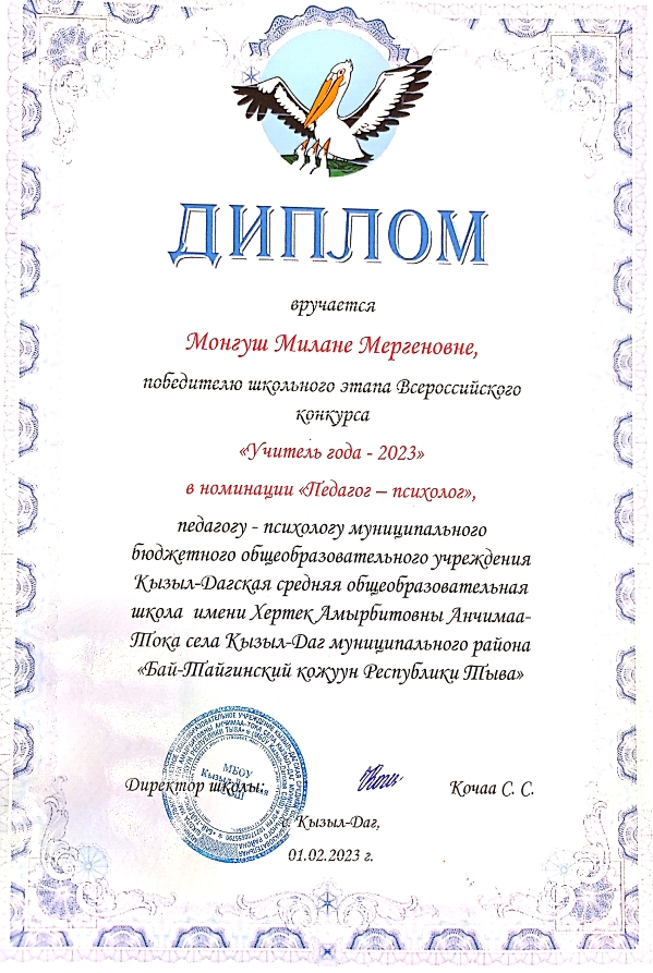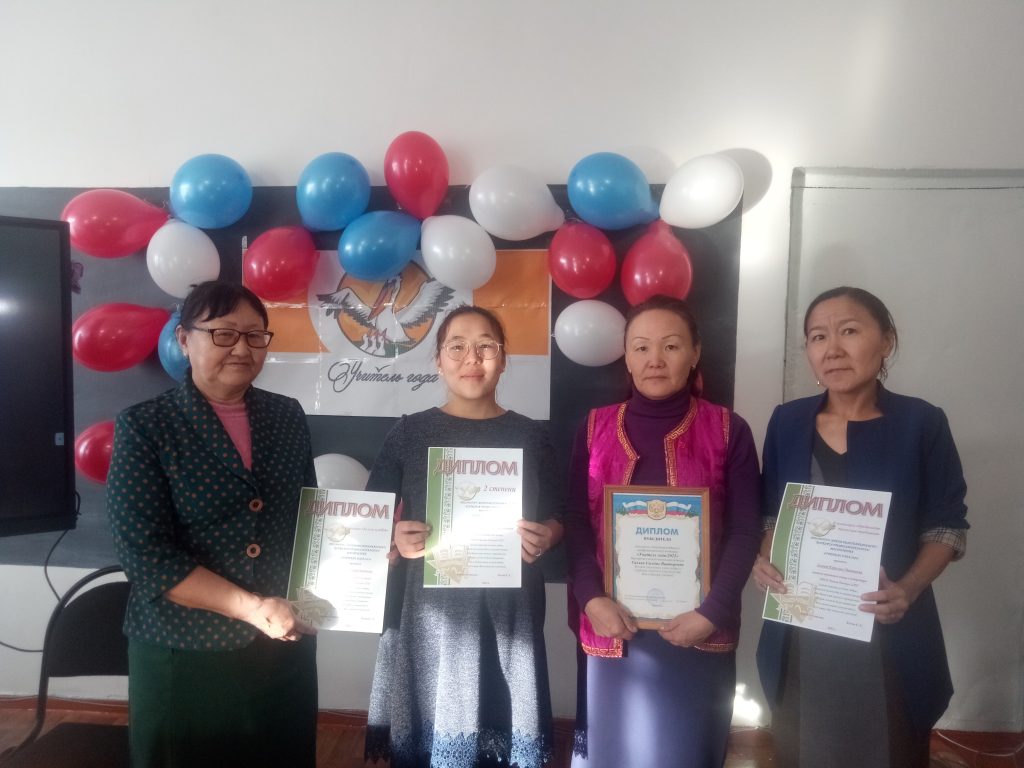 Монгуш Милана Мергеновна победитель в номинации «Педагог-психолог». -Победитель конкурса «Всероссийский мастер-класс учителей родного, в том числе русского, языка» — Салчак Кара-кыс Даниловна, учитель родного языка и литературы