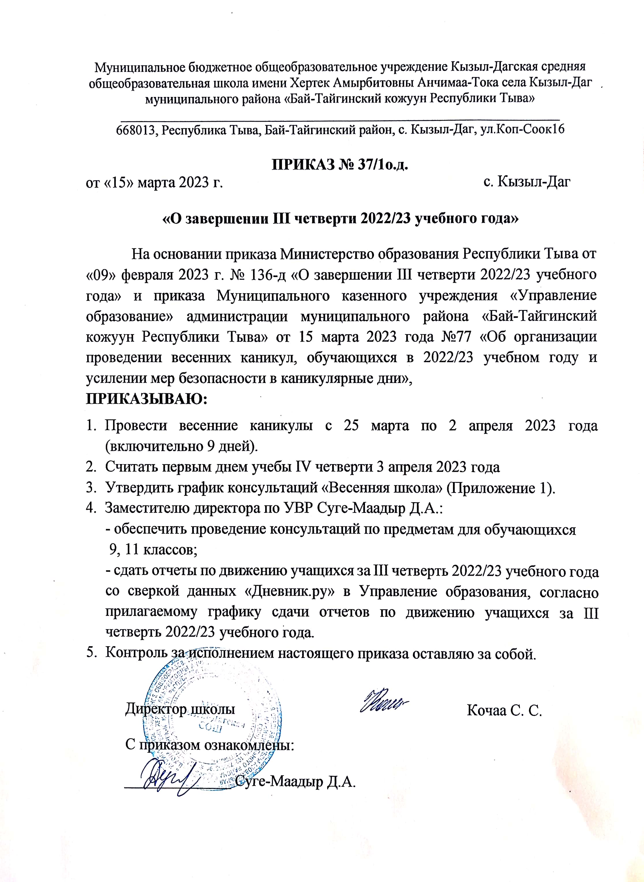 24 марта 2023 года после 6 урока в МБОУ Кызыл-Дагская СОШ был проведен комплексный инструктаж для учащихся 1-11 классов на тему «Безопасность во время весенних каникул».