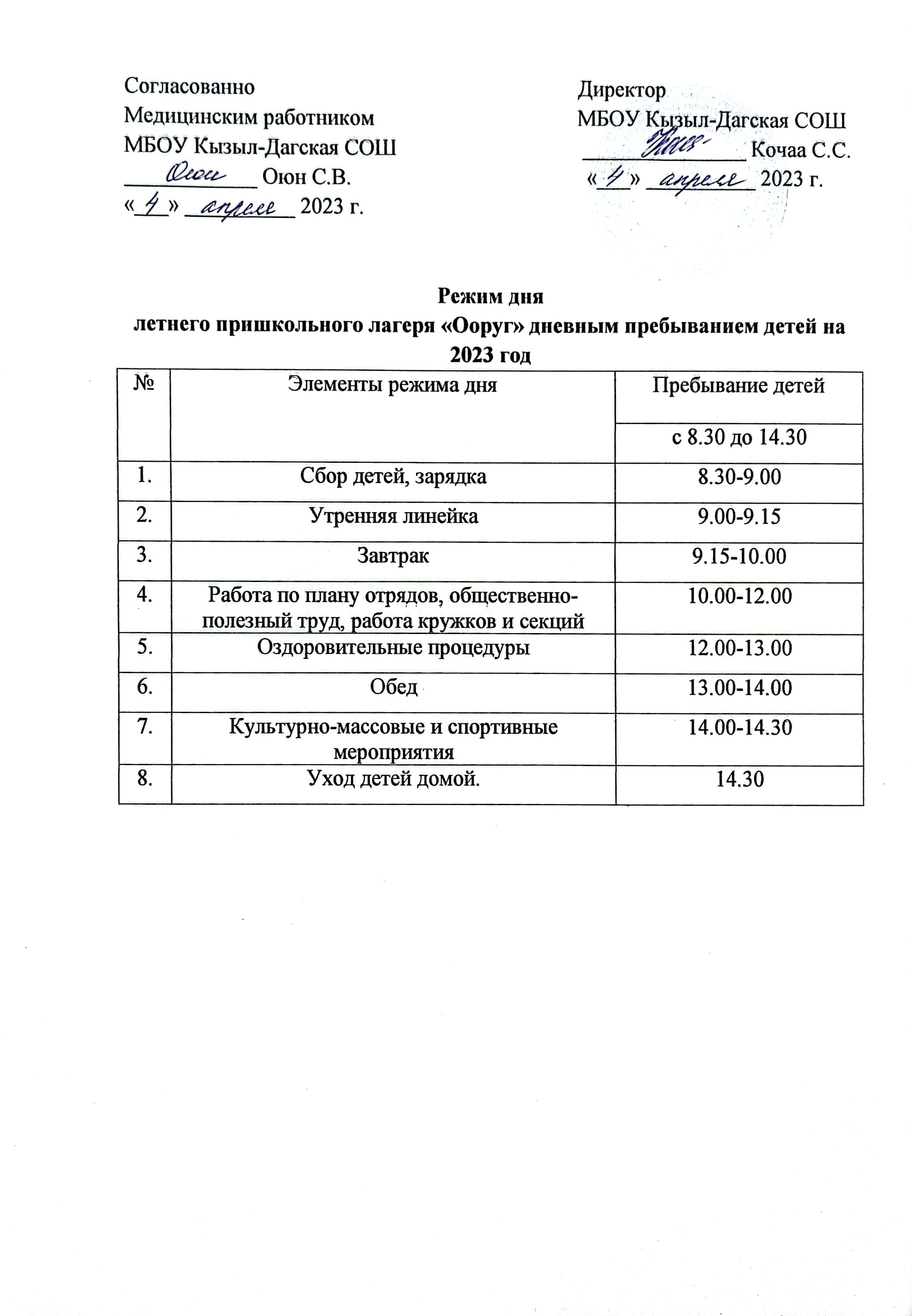 9 июня 2023 года состоялся торжественное открытие пришкольного лагеря с дневным пребыванием детей «Ооруг». Во время торжественного открытия была проведена церемония поднятия государственного флага Российской Федерации, а также дети исполнили гимн России и Республики Тыва. В течении дня дети танцевали, играли в игры со сладостями, смеялись. А также побывали в святых местах села.