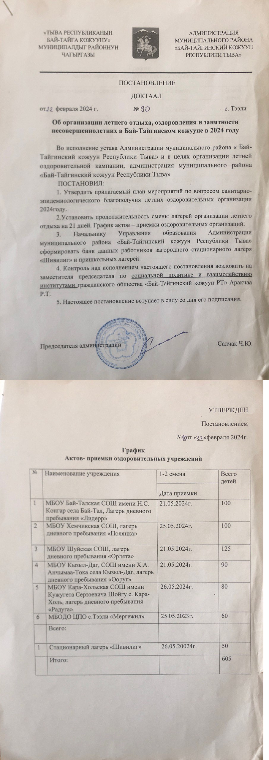 - Распоряжение Правительства Республики Тыва №301-р от 30.07.2020 г. «О проведении летней оздоровительной кампании 2020 года в Республике Тыва»