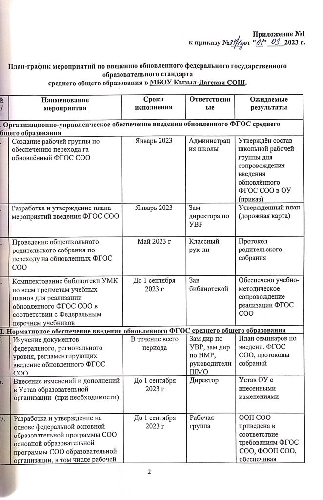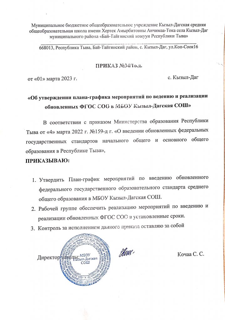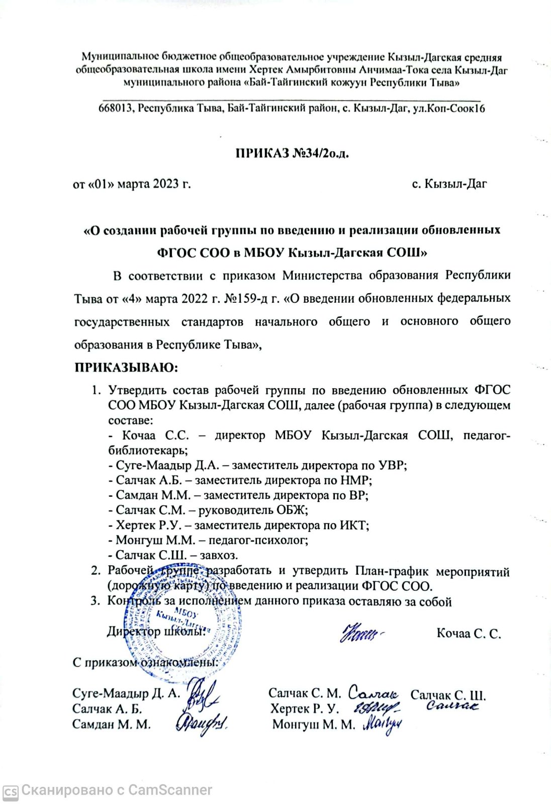 Приказ №34/2о.д. от 01 марта 2023г. «О создании рабочей группы по введению и реализации обновленных ФГОС СОО» Скачать