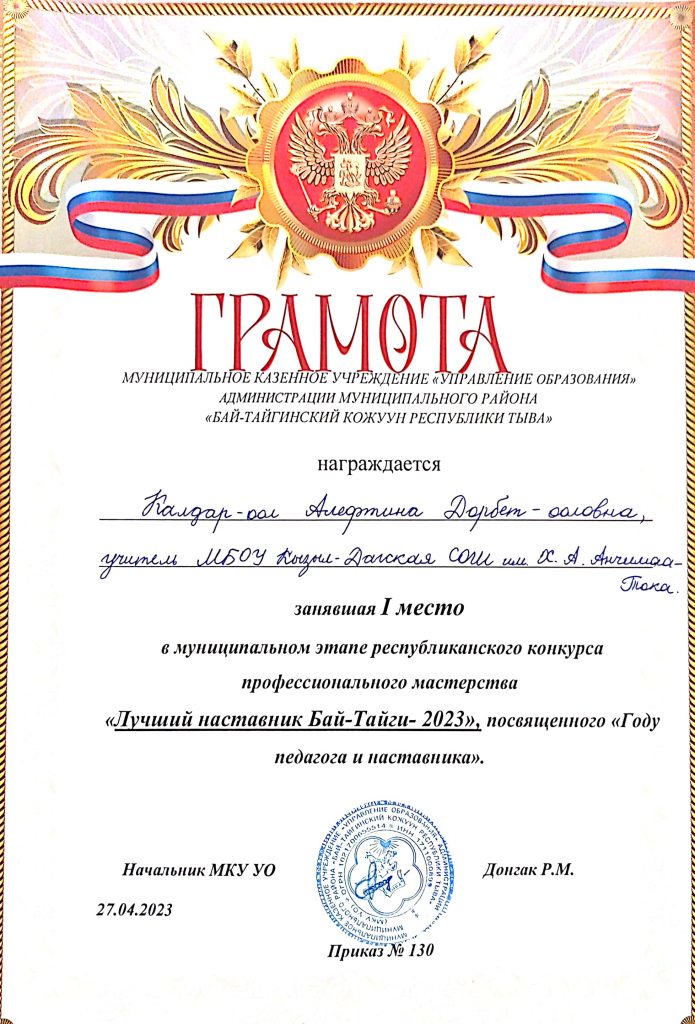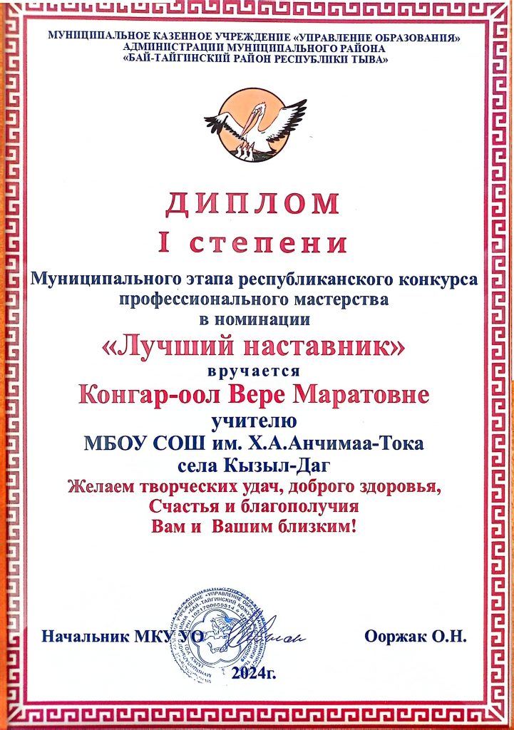 31 мая 2023г. церемония награждения и закрытие конкурса профессионального мастерства «Лучший наставник Республики Тыва — 2023» в торжественной обстановке. Всего участников 44 , из них 19 конкурсантов прошли в финал. По результатам конкурсного испытания номинантом стала учитель математики Калдар-оол Алефтина Дорбет-ооловна в номинации «Традиционное педагогическое наставничество» Желаем профессиональных успехов и крепкого здоровья!