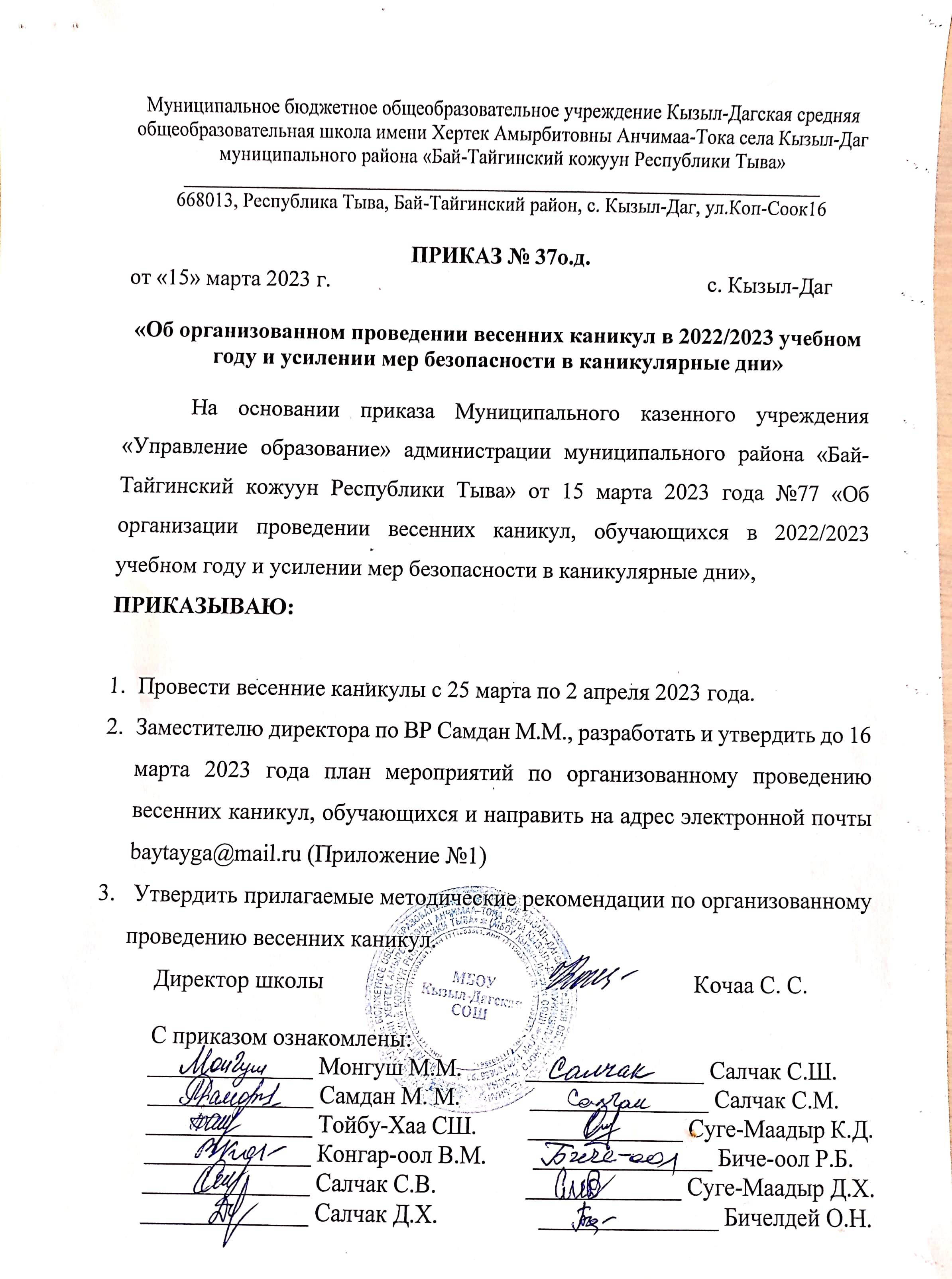Приказ №37 о.д. » Об организованном проведении весенних каникул в 2022-2023 уч.г. и усилении мер безопасности в каникулярные дниСкачать